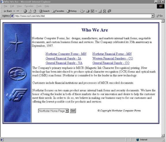 The purpose of this paper is to provide the reader with information related to the design; development and implementation of a Unix based Electronic Commerce application. This paper represents the actual development used by Northstar Computer Forms and it’s subsidiary companies, Northstar Financial Forms, General Financial Supply, and Western Financial Suppliers and can be found on the Internet at www.nscf.com, www.nsff.com, www.genfinsup.com, www.micrlink.com, and www.cachmanagementsupply.com.