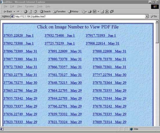 This program invokes a Unix command to create a listing in reverse order by date, and places the output in a file named ‘UBLFILES’. This file is then read and filenames are extracted in the main line of the program. The header sub-routine 1000, creates the header section of the resulting HTML code. The body sub-routine 1100, creates a table of HTML code containing three PDF hyperlinks per row until the file is completely processed and then the footer of the HTML is added to the output file by sub-routine 1200. Sub-routine 1300 is executed to delete the remaining old PDF files as they are no longer accessible by the HTLM code. The PDFFILE data file is then renamed to ‘pdffiles.html’, the permissions are set to allow the appropriate access to users, and an email of the process is sent to the system manager for confirmation of process completion. The resulting Web page and html code are shown below.
